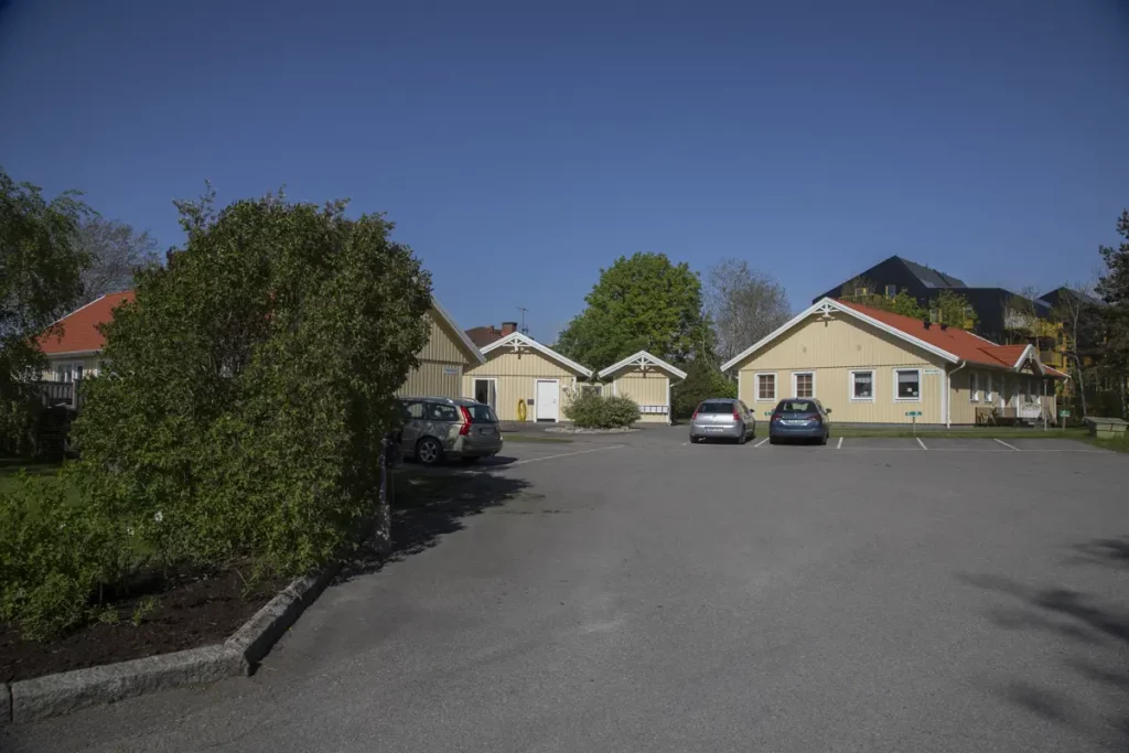 I mitten av bilden ovanför det vänstra lilla huset med den vita dörren, där skymtar taket på huset på bilden ovanför.