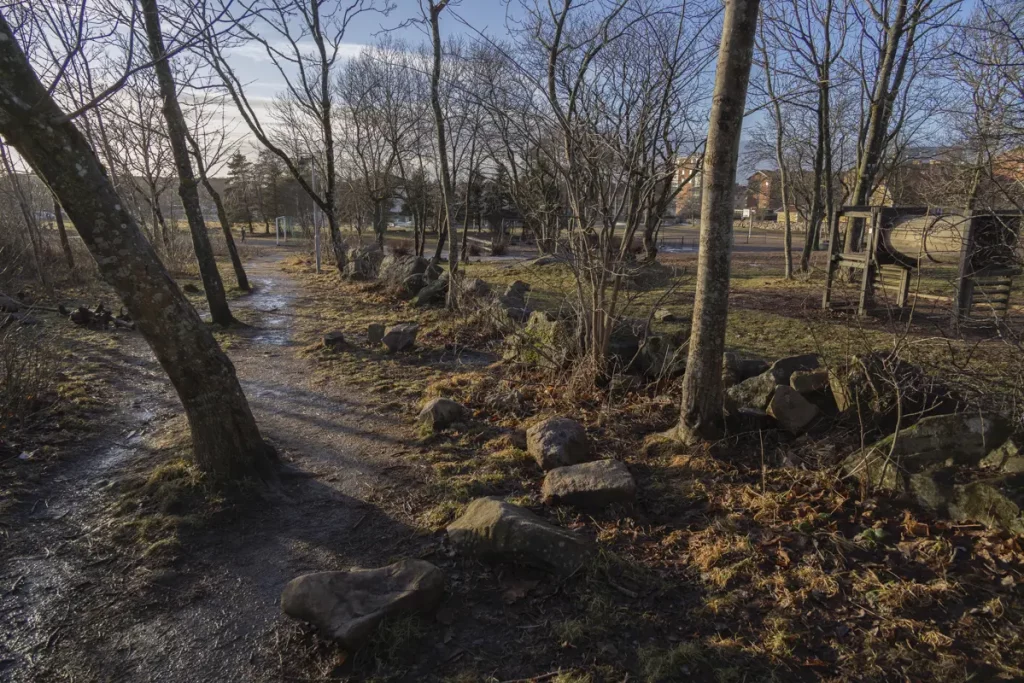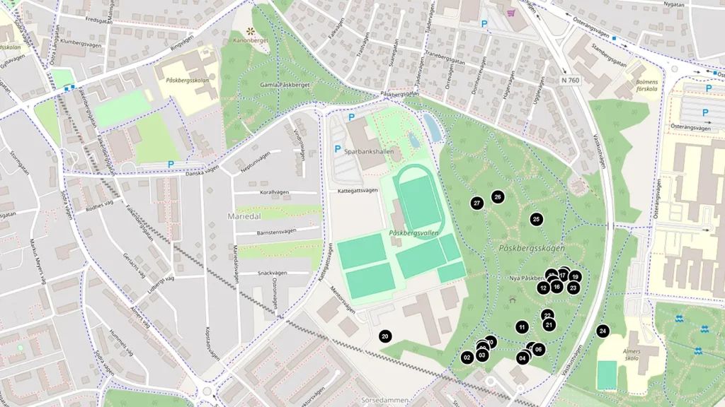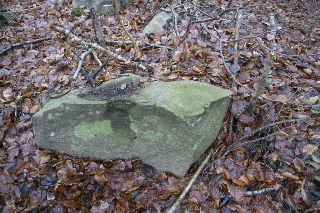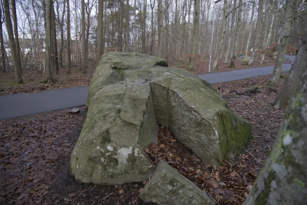 På alla dessa platser har man borrat och sprängt. Ett urval av bilder nedan. Enligt karta från 1855 ska det ha funnits ett berg här, där flertalet punkter finns, i syd östra hörnet av skogen, plats 19 och 23 är lite större stenbrott. På Danska vägen finns ingen markering platsen är där Danska vägen och Mariedalsvägen möts bakom förskolan där.