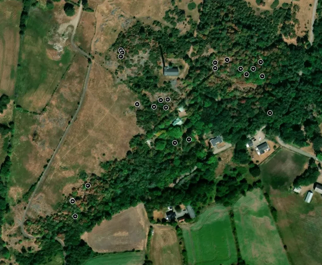 Bings satellitfoto, här har jag hittat flera stenbrott på södra sidan av Bastekullen. Markeringarna är från min Gps. Största stenbrottet finns i mitten av bilden nr 12-11, det är svårt att ta sig dit, ligger på toppen av ett berg dessutom på en privat tomt, vilken jag inte gick in på. De flesta men inte så stora, som i högra övre hörnet, det finns många fler där och de ligger tätt. Erlandsgården gränsar i nedre vänstra hörnet. Det stenbrott som syns bäst är nr24 övre vänstra hörnet det ligger ute på ängen.