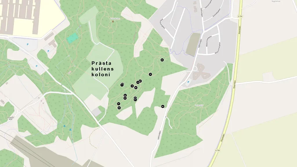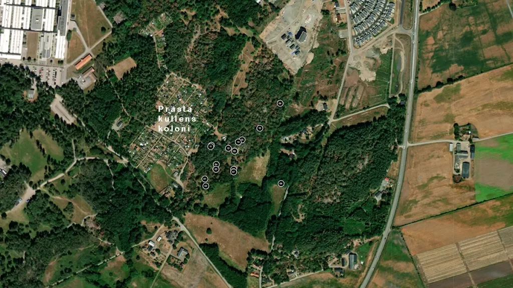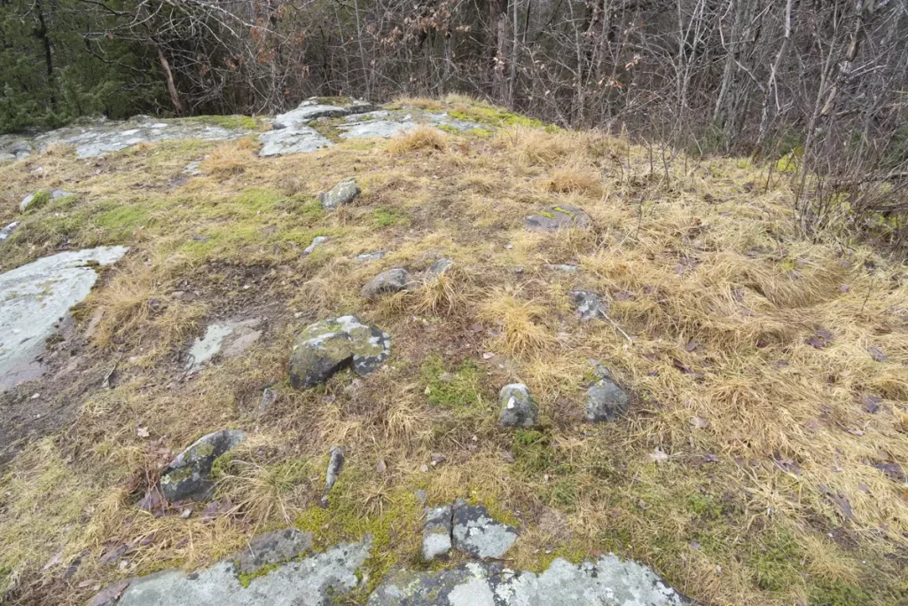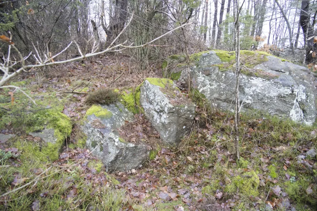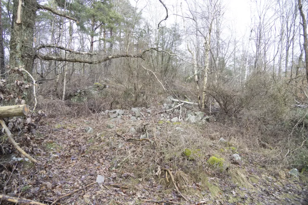 1) Stensättning, rund, 7 m diam och 0.2 m h. Övertorrvad med i ytan talrika stenar 0.1 – 0.4 m st. Gropig i ytan samtkantskadad i Ö – S – V 1 – 2 m in i stensättningen. 1 m SV ommitten är en eldstad med stenar 0.2 -0.3 m st Delvis beväxt med ljung.50 m NNV om nr 1 är:2) Stensättning, rund, 10 – 11 m i diam och 0.3 m h. Övertorvadmed i ytan talrika stenar 0.1 – 0.3 m st. Gropig yta samt något otydlig kant, särskilt i den SV delen.Beväxt med ljung samt aspsly.17 m SV om nr 2 är:3) Stensättning, rund 7 – 8 m i diam och 0.2 m h. Övertorvad med i ytan talrika stenar 0.1 – 0.3 m st samt några större stenar intill 0.75 m st. Gropig i ytan samt kantskadad.Beväxt med en enbuske samt rikligt med aspsly.