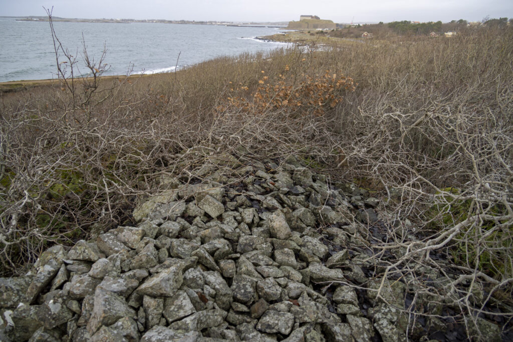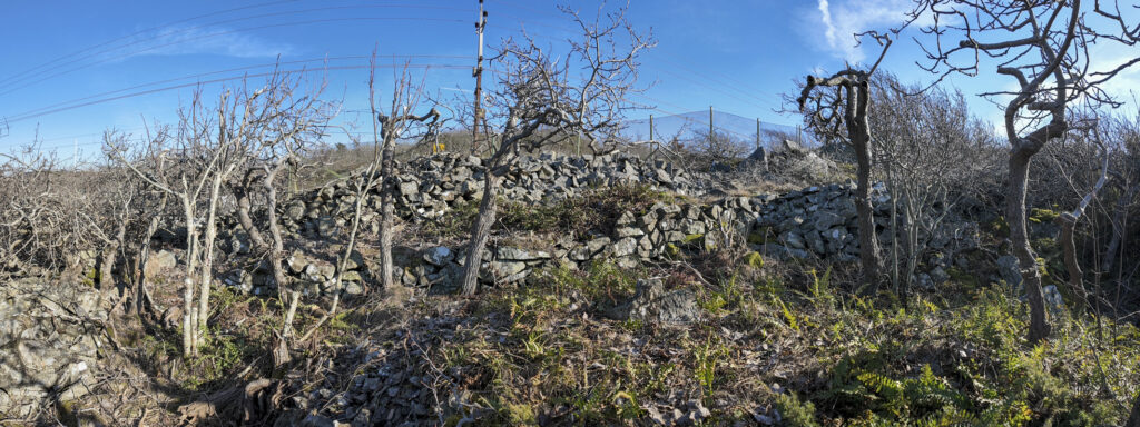 Den undre muren är en uppgång för det branta berget, bakom finns en stenhög. I förgrunden stod stenhuggaren och högg sina stenar (gatsten?) Finns en massa flis som inte syns på bild.