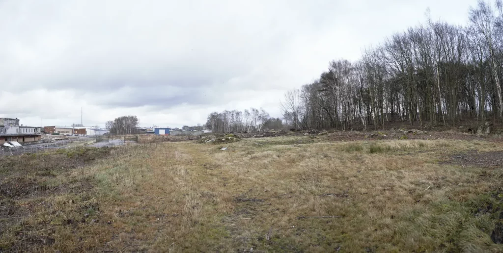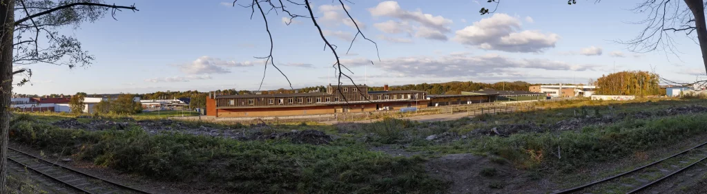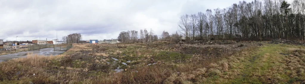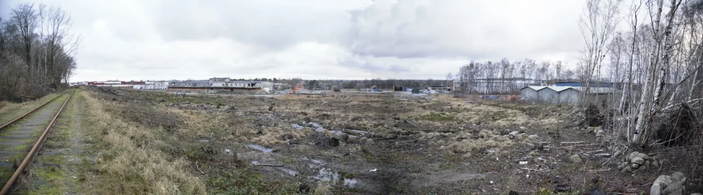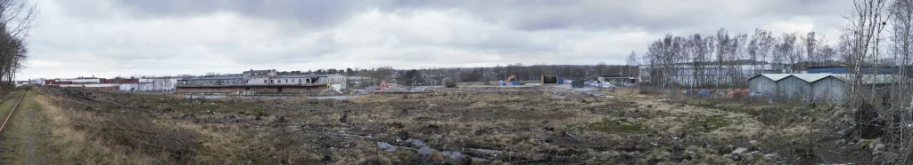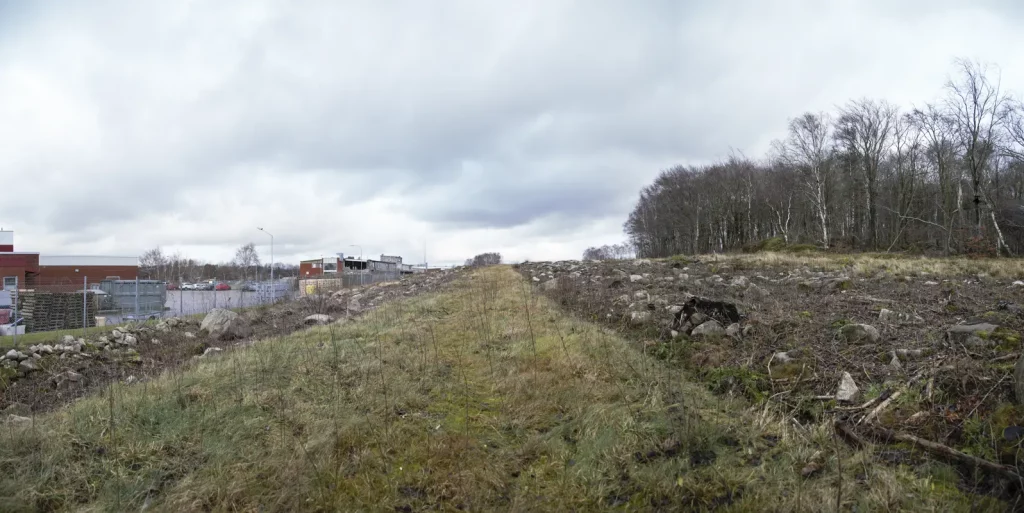 2015 dec från väst banvallen uppe till höger, till vänster om staketet fanns ett stickspår som gick nästan fram till Äckregårdsvägen (Varbergs Bildepot)