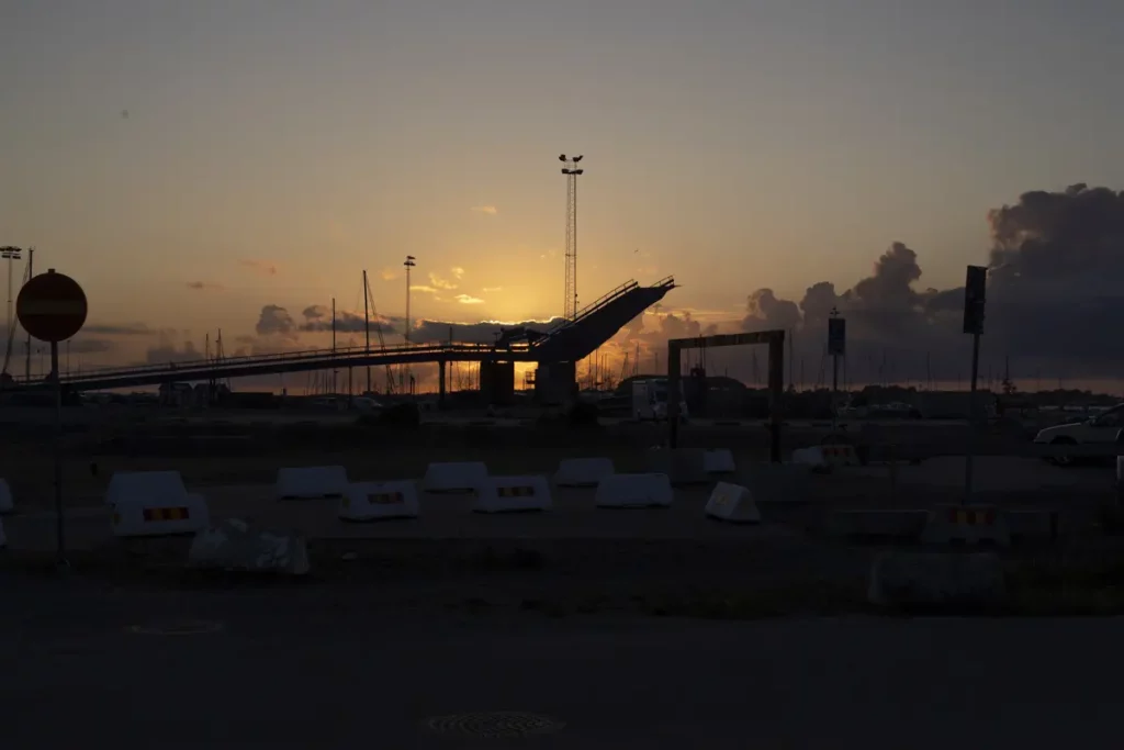 Lastbilar som väntar på färjan, silos och en oförstörd stad