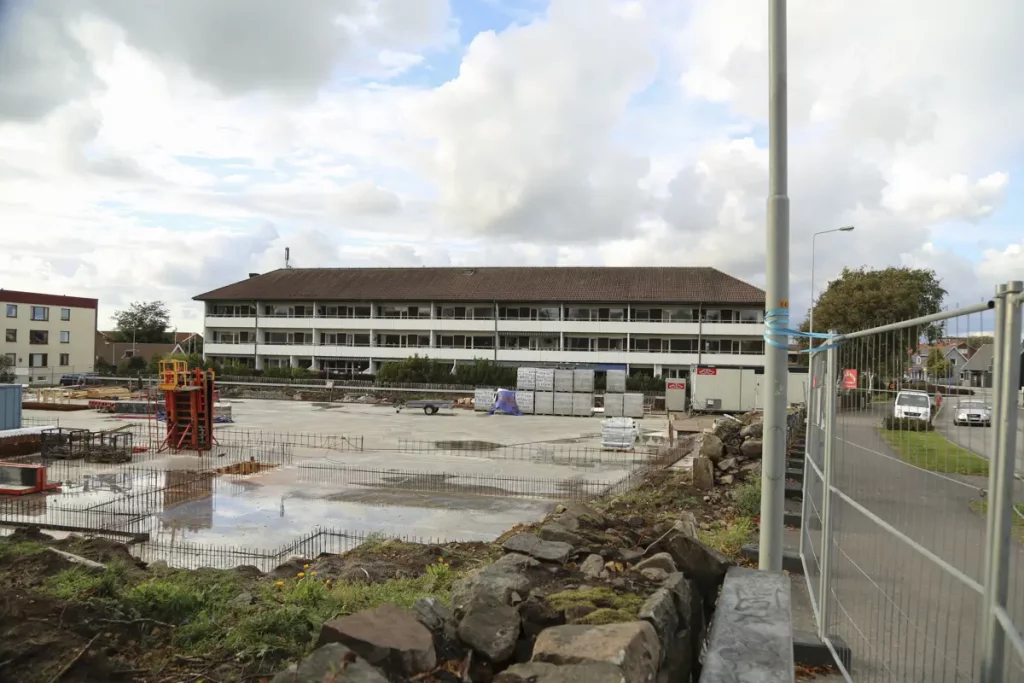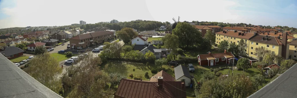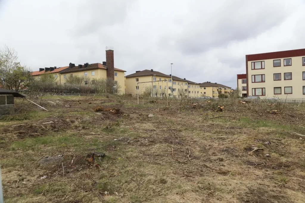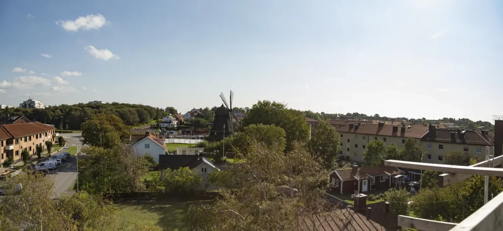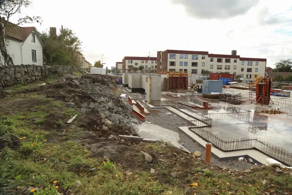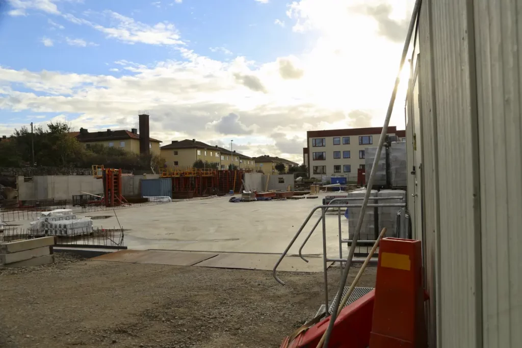 Vy mot söder, vi kan se att Södra vägen 50-52 håller på att byggas bortom kvarnen